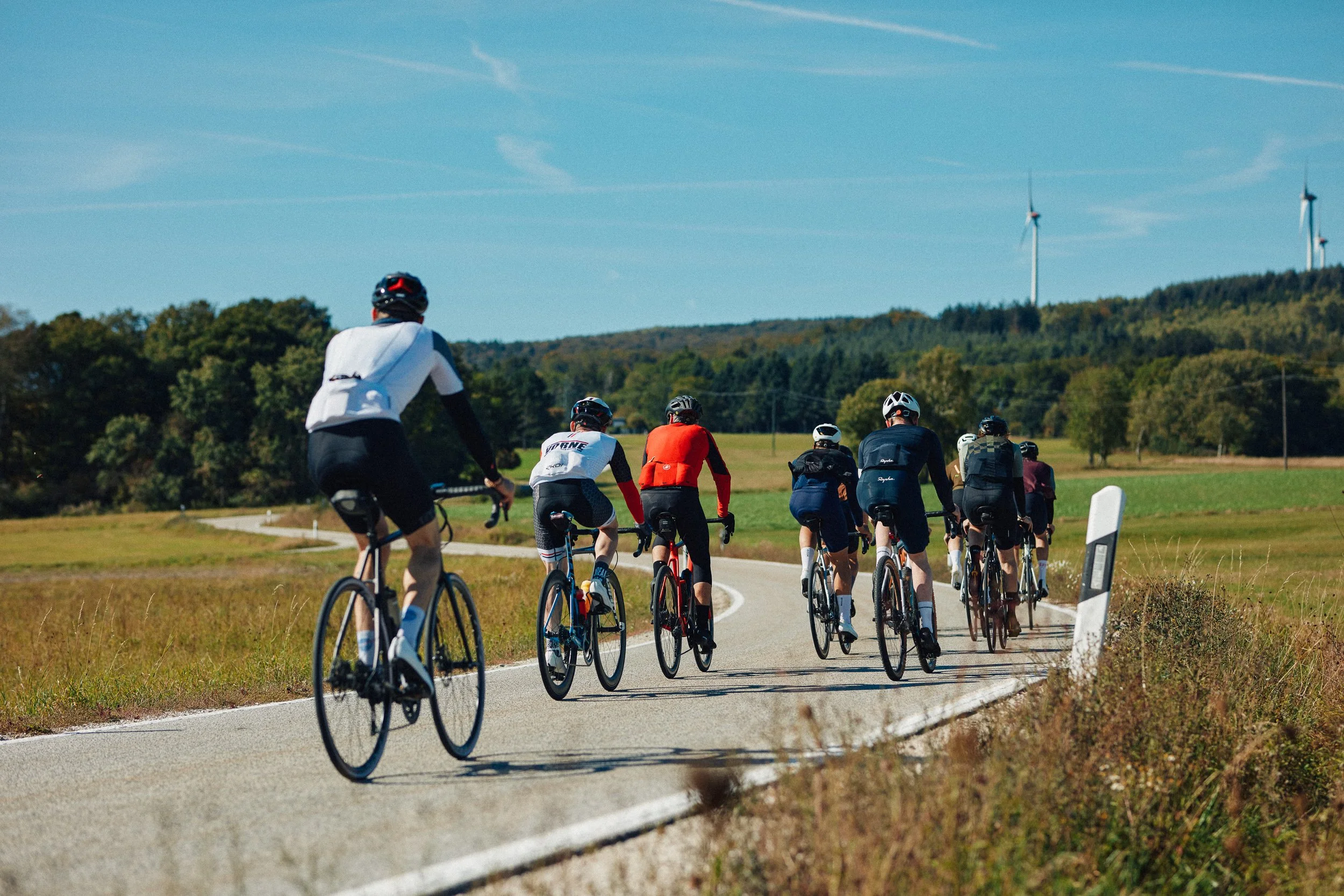 los geht’s! von Weiler aus ging es direkt mit einem leichten anstieg in richtung hunsrück. entlang des soonwalds führte unsere route am ersten tag die ersten kilometer nördlich der nahe, bis wir diese bei Bad münster am stein überquerten & richtung alte welt aufbrachen. als alte welt bezeichnen wir die region richtung meisenheim/kaiserslautern. wundervolle strassen, viele anstiege & kaum verkehr, eine richtig tolle gegend um einmal abzuschalten. die gruppe passte gut zusammen, keine ausfälle oder groben leistungsunterschiede waren zu verzeichnen. und dann, bei der abfahrt richtung schmittweiler passierte der wohl verrückteste moment des tages. eine rinderherde durchbrach parallel zu uns laufend das geheke und jagte einem teil von uns hinterher. der puls sprang auf 180. alle unverletzt ging es von schmittweiler aus richtung meisenheim, wo unsere erste richtige pause auf uns wartete. bei kaffee & kuchen liessen wir die vergangenen kilometer revue passieren. gestärkt & motiviert ging es wieder aufs rad über leichte anstiege & schöne abfahrten nach meddersheim. dort rollten wir straight auf den hof des Wein– und Sektgut bamberger. ute & Heiko empfingen uns mit so viel herz & guter laune, sodass wir direkt die leiden der letzten kilometer vergessen liessen. ute reichte uns nach kurzem durchschnaufen direkt das erste glas sekt. bubbles against troubles oder wie war das? snacks standen im garten auch schon für die stärkung bereit. nach einer allgemeinen einführung über die region, das wein– sektgut ging es in die heiligen hallen. das thema sekt stand heute auf dem plan. ute & heiko erklärten und derart spielerisch & dennoch höchst kompetent die besonderheiten der sektbereitung. von den rüttelplatten, über den keller & einige kleine schlücke ging es zum entspannten ausklang wieder in den garten. gestärkt, Glücklich & um ein ordentliches Stück schlauer führte der weg flach entlang der nahe wieder zurück zu unserer unterkunft nach weiler. im garten des schmidtburger hofs liessen wir den tollen tag bei getränken ausklingen bis sich jeder für ein paar ruhige minuten aufs zimmer zurückzog. leckere regionale küche erwartete uns zum abend. Elisa & ihre schwestern machten einen richtig tollen job. begleitet wurde das abendessen von ausreichend yummy bubbles von bambergers. bei tollen gesprächen & mächtig vorfreude auf den nächsten tag ging es dann nach & nach für jeden aufs zimmer. energie tanken & die eindrücke verarbeiten.